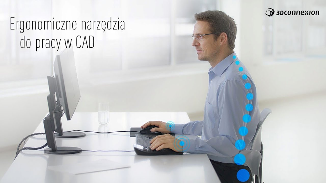 The two-handed working style proposed by 3Dconnexion – with a 3D mouse in the left hand and a standard mouse in the right hand – relieves strain on the right hand, which protects against hand-bar injuries and forces an upright posture of the CAD designer while sitting.